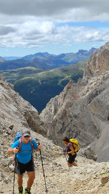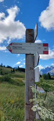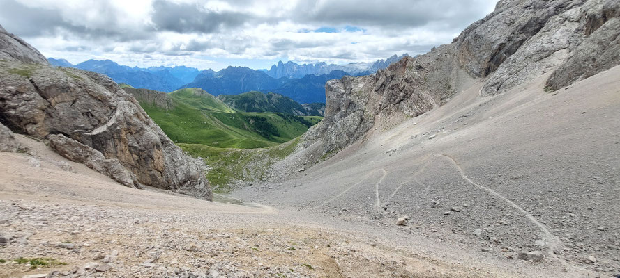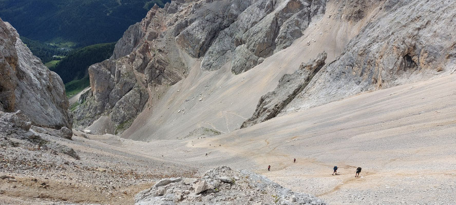 Salita impegnativa su un bel ghiaione incastonato nella valle Tas Cia fino al Passo a quota 2683 che mette in contatto la Val San Pellegrino alla Val di Contrin. Il passo durante la prima guerra mondiale fu linea di confine tra il territoiro italiano e quello austro-ungarico e sono ancora ben visibili le trince, tracce di filo spinato e resti di baracche.